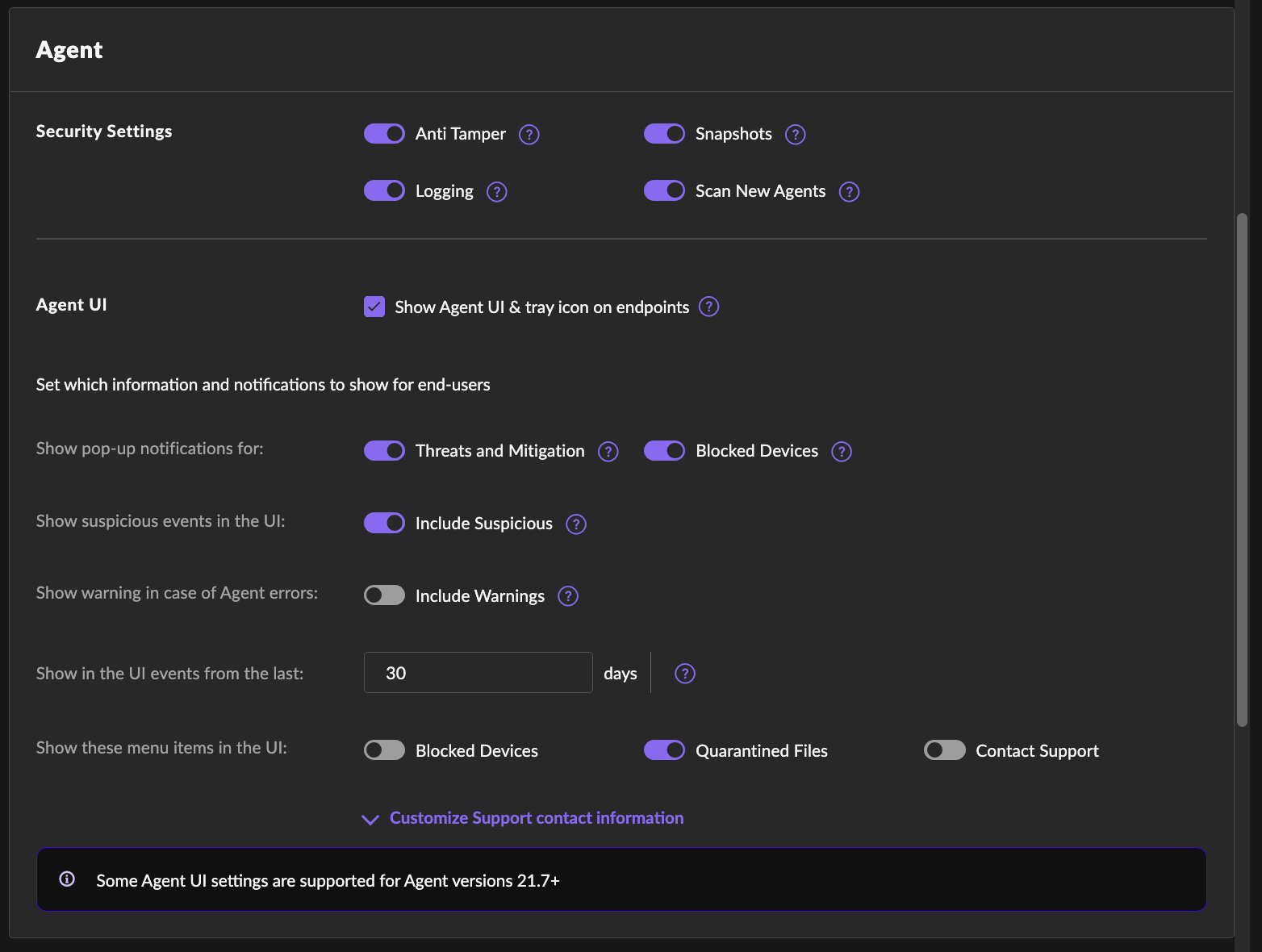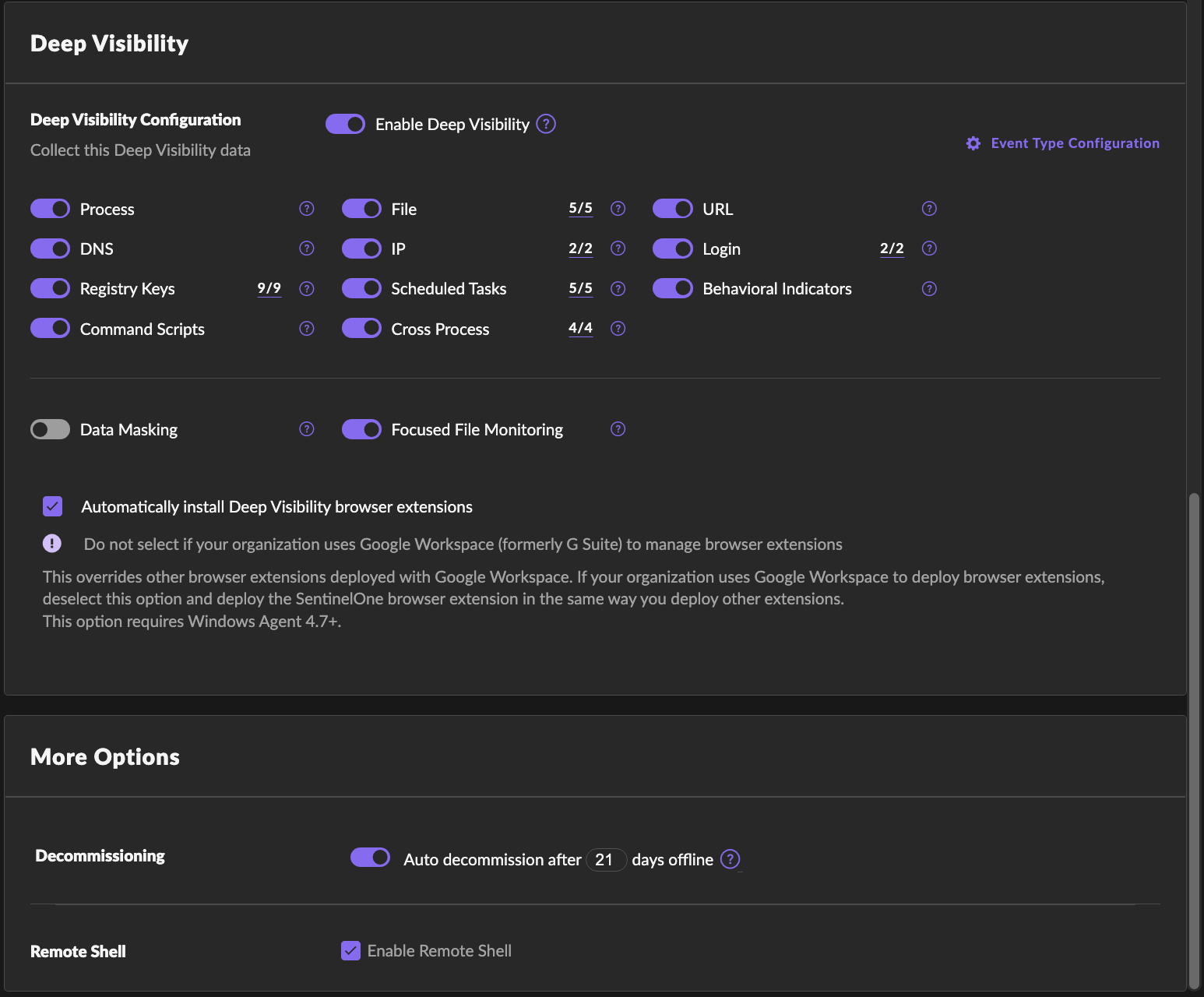 Scan the agents, allow to scan endpoint, gather user logs, create snapshots and anti-tamper functionality. Recommendation: Enable all.