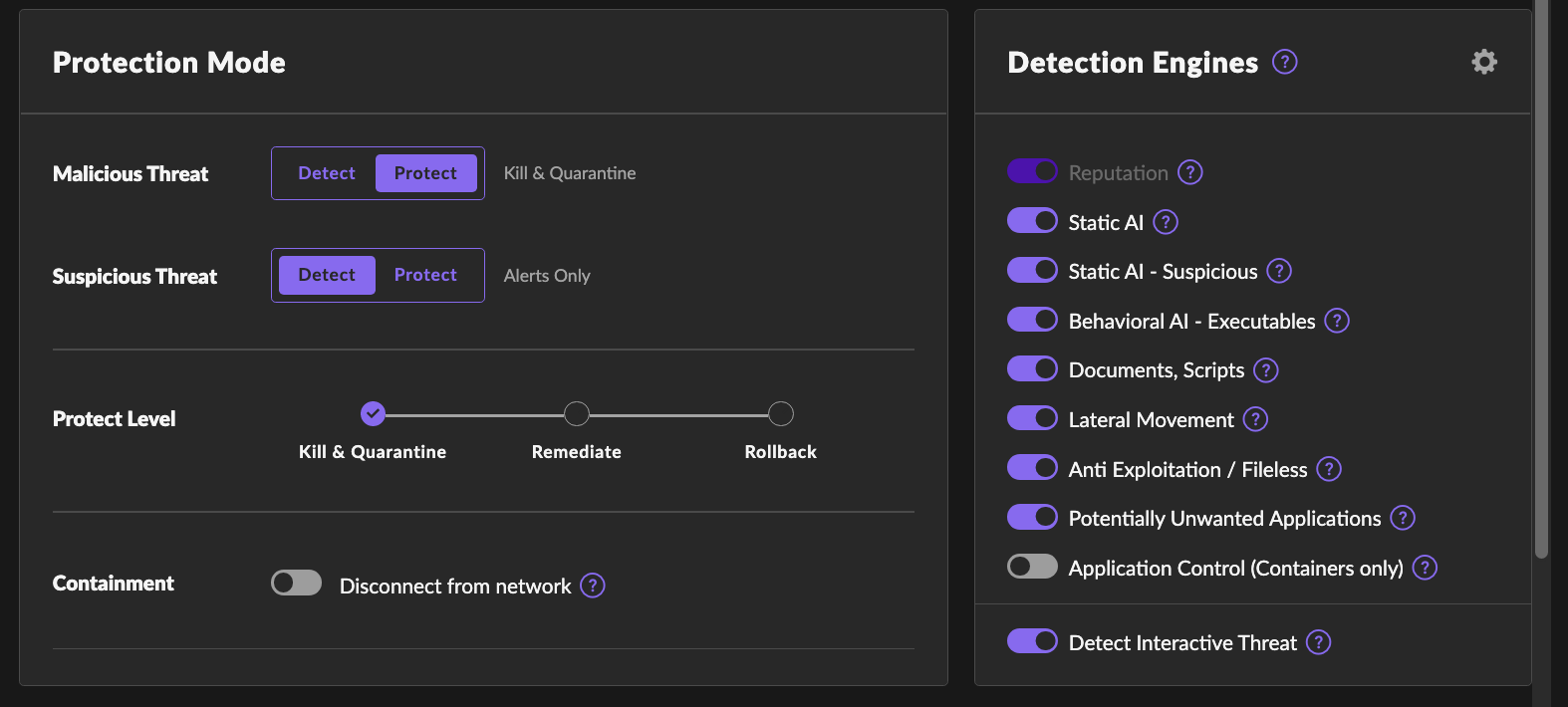 · https://support.sentinelone.com/hc/en-us/articles/115005654289-Policy-Mode-Best-Practices