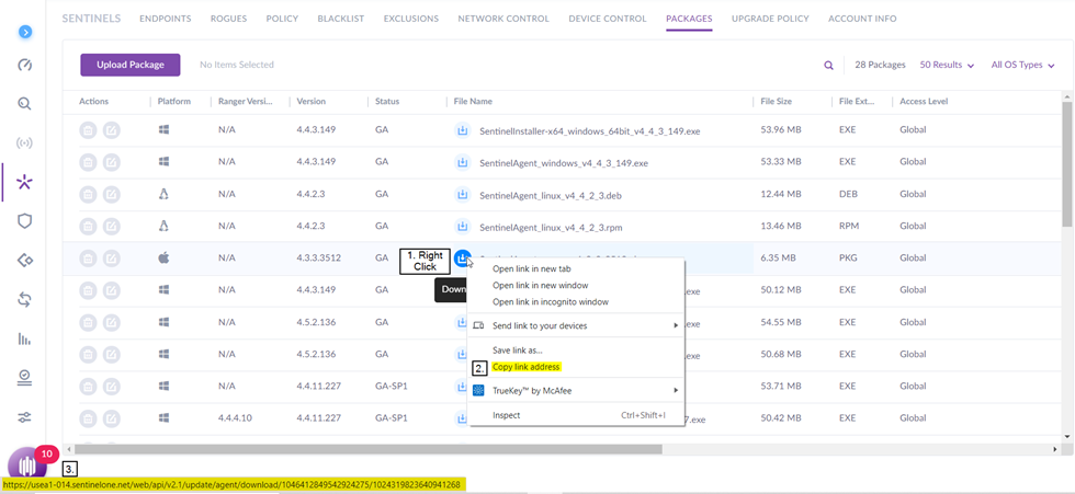 o For Package URL: Go to the SentinelOne Console-Sentinels Tab-Packages.