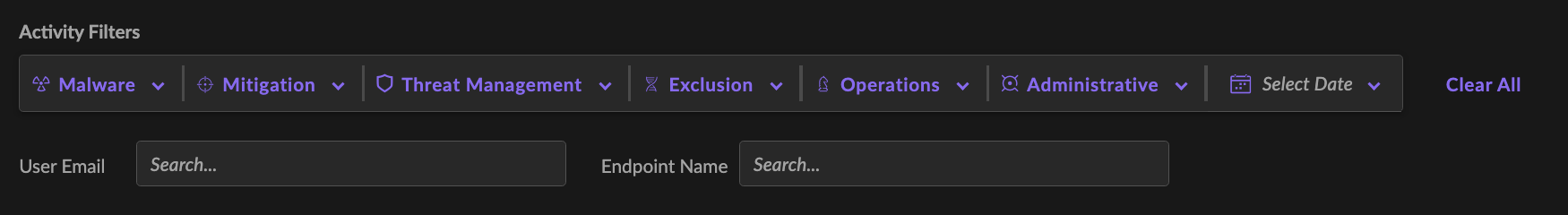 The activity is to check the activities done by SentinelOne Agents and the Console management users. You can track the events, collect endpoint logs that are generated and filter the activities according to your need by selecting options from dropdown in the tabs.